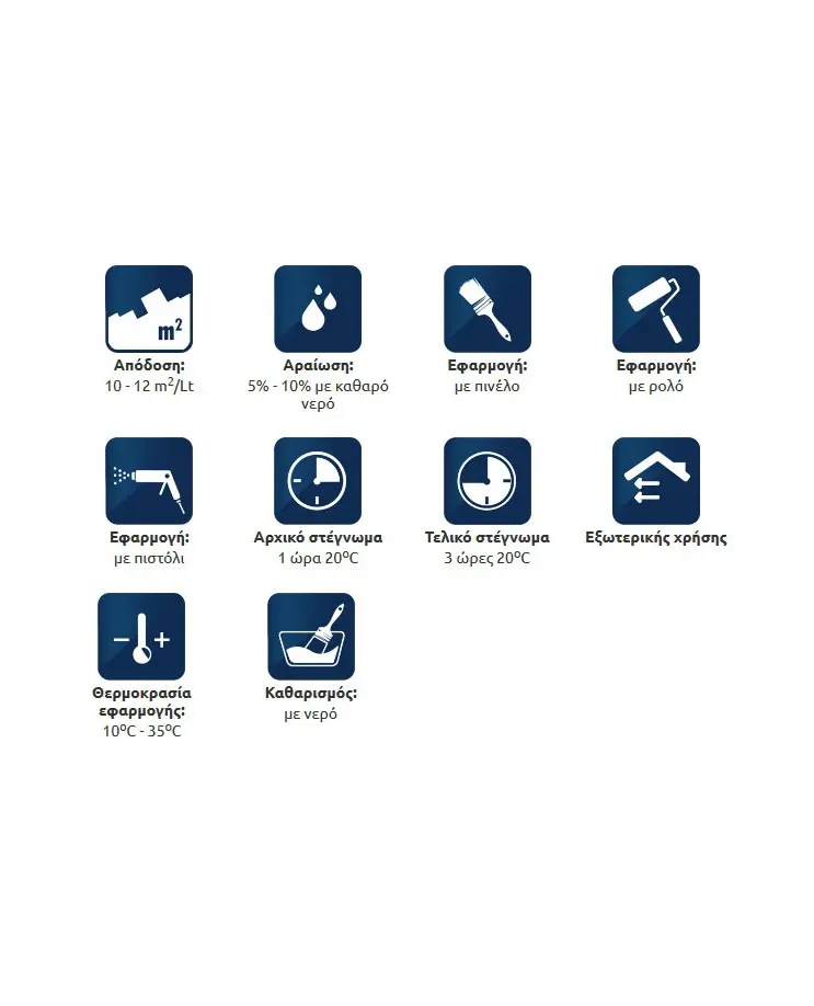 Έχει άριστη καλυπτικότητα, εξαιρετική πρόσφυση, απλώνεται εύκολα και έχει μεγάλη αντοχή στις δυσμενείς καιρικές συνθήκες και στην ατμοσφαιρική ρύπανση.