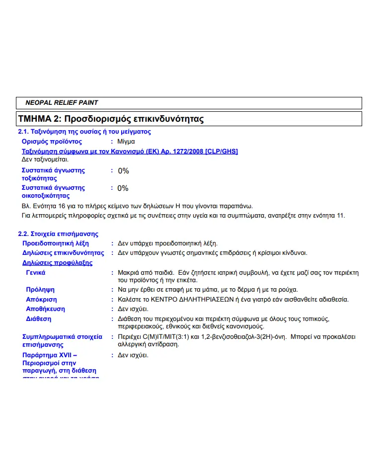 Tο NEOPAL RELIEF διατίθεται σε λευκό χρώμα, σε συσκευασίες των 5Kg και 15 Kg.