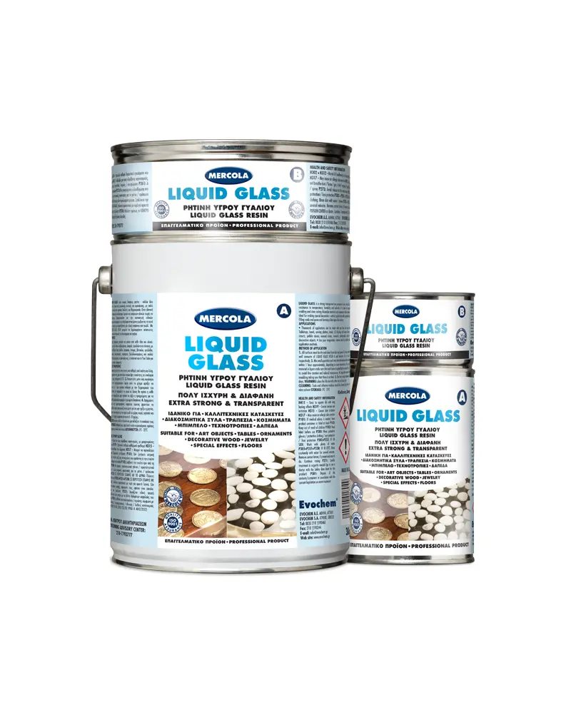 Η Διάφανη Ρητίνη Υγρού Γυαλιού Δύο Συστατικών 1 Κιλού Liquid Glass Mercola είναι ισχυρή, διάφανη εποξειδική ρητίνη υγρού γυαλιού, δύο συστατικών, εξαιρετικής μηχανικής αντοχής και πρόσφυσης, με πολύ μεγάλη αντοχή στην υγρασία, διαλύτες και θερμοκρασία.