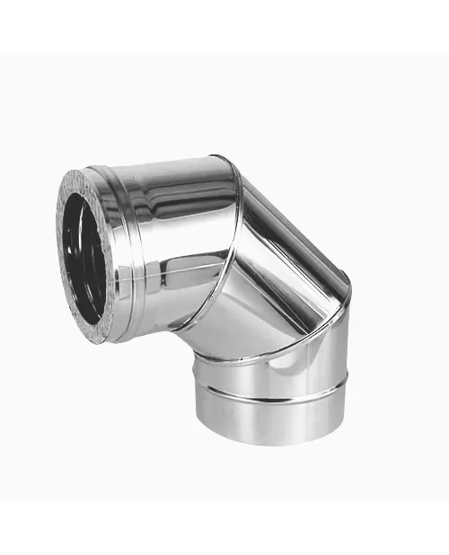 Η Γωνία Σωλήνας Καπνοδόχου 90 Μοιρών Διπλού Τοιχώματος Ανοξείδωτη Φ80-Φ130 Aisi 304 BA Inoxshell έχει μόνωση κεραμοβάμβακα πάχους 25 χιλιοστών μέ πυκνότητα 96 κιλά ανά κυβικό μέτρο.