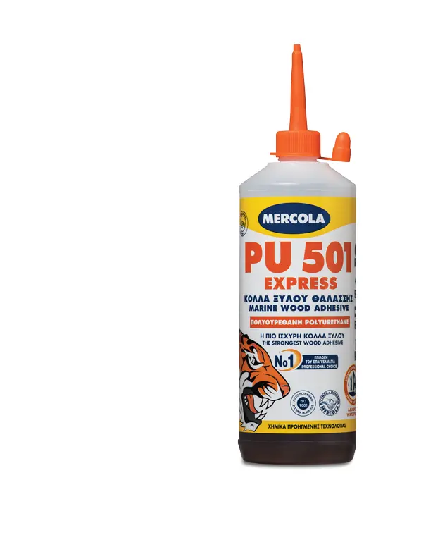 Η Κόλλα Ξύλου Θαλάσσης Πολυουρεθάνης Pu 501 Express 750 Γραμμαρίων Mercola είναι εξαιρετικά ισχυρή και πολύ γρήγορη κόλλα πολυουρεθάνης, μελί χρώματος, ενός συστατικού.