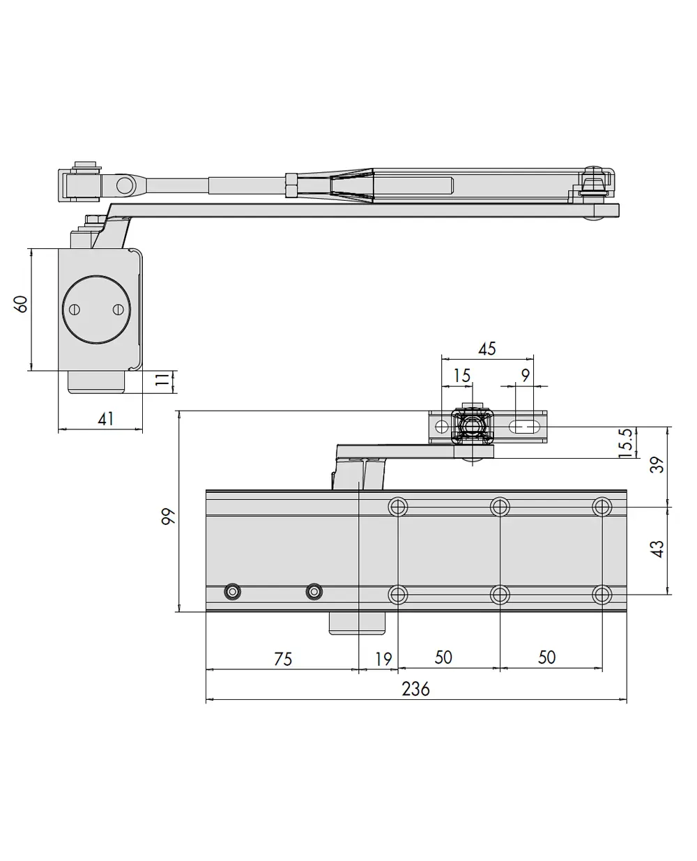 Σέ αλουμίνιο 4.5 χιλιοστά σέ σίδερο 4 χιλιοστά.Βιδώνουμε μηχανισμό στήν πόρτα καί βραχίονα στήν κάσα.