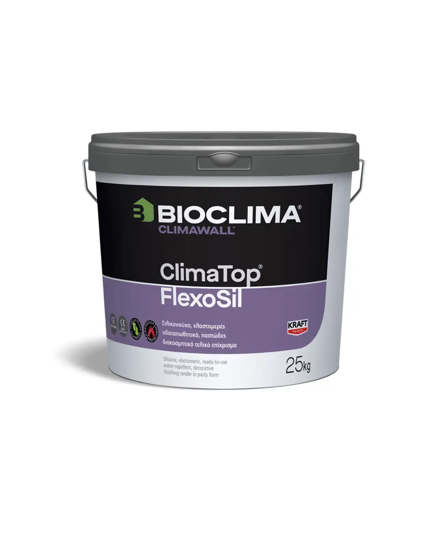 Το Σιλικονούχο Παστώδες Τελικό Επίχρισμα Λευκό 25 Κιλών Clima Top (R15 1.5MM Κοκκομετρία) Flexosil Climawall Bioclima είναι ένα διακοσμητικό, έτοιμο προς χρήση, σε μορφή πάστας, σιλικονούχο, ελαστομερές & υδαταπωθητικό, τελικό επίχρισμα.
