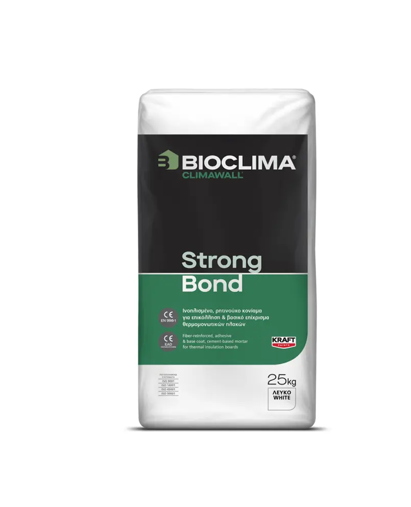 Ή Κόλλα Θερμομονωτικών Πλακών 25 Κιλών Λευκή Strong Bond Climawall Bioclima είναι ένα Ινοπλισμένο,