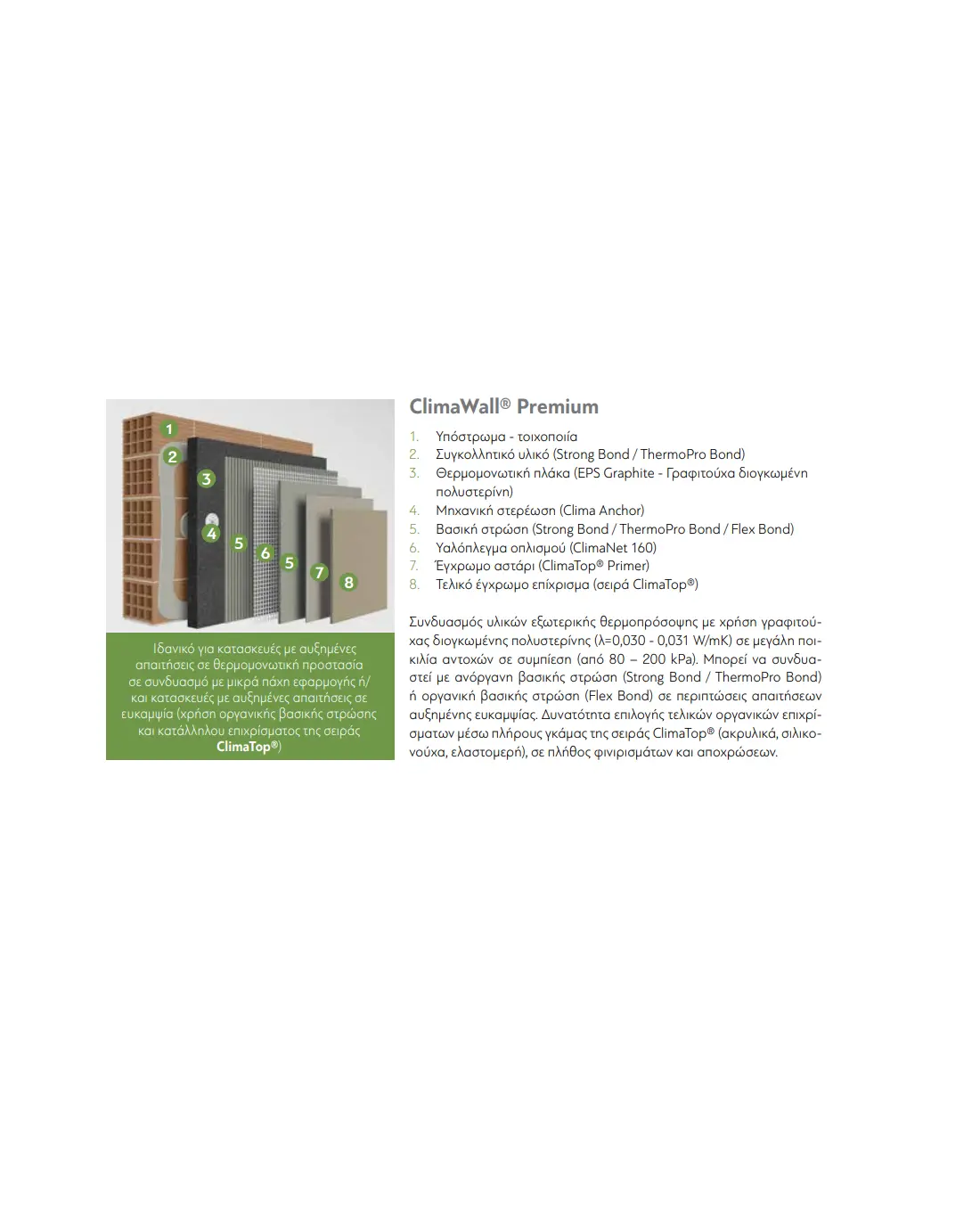 Το Ολοκληρωμένο Σύστημα Εξωτερικής Θερμομόνωσης Μέ Ενδεικτικό Κοστος Υλικών Clima Wall Premium N.1 Bioclima διαφοροποιείται από το σύστημα Clima Wall Classic γιατί λόγω υλικών είναι ιδανικό για κατασκευές με αυξημένες απαιτήσεις σε θερμομονωτική προστασίας σε συνδυασμό με μικρά πάχη εφαρμογής