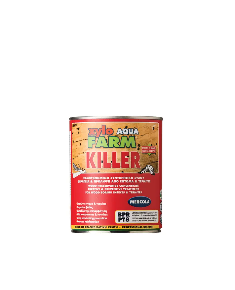 Το XYLOFARM AQUA KILLER είναι ειδικά σχεδιασμένο για εντομοκτόνο θεραπεία ξυλείας που έχει προσβληθεί, ή που μπορεί να επηρεαστεί από έντομα που προσβάλλουν το ξύλο και τερμίτες.