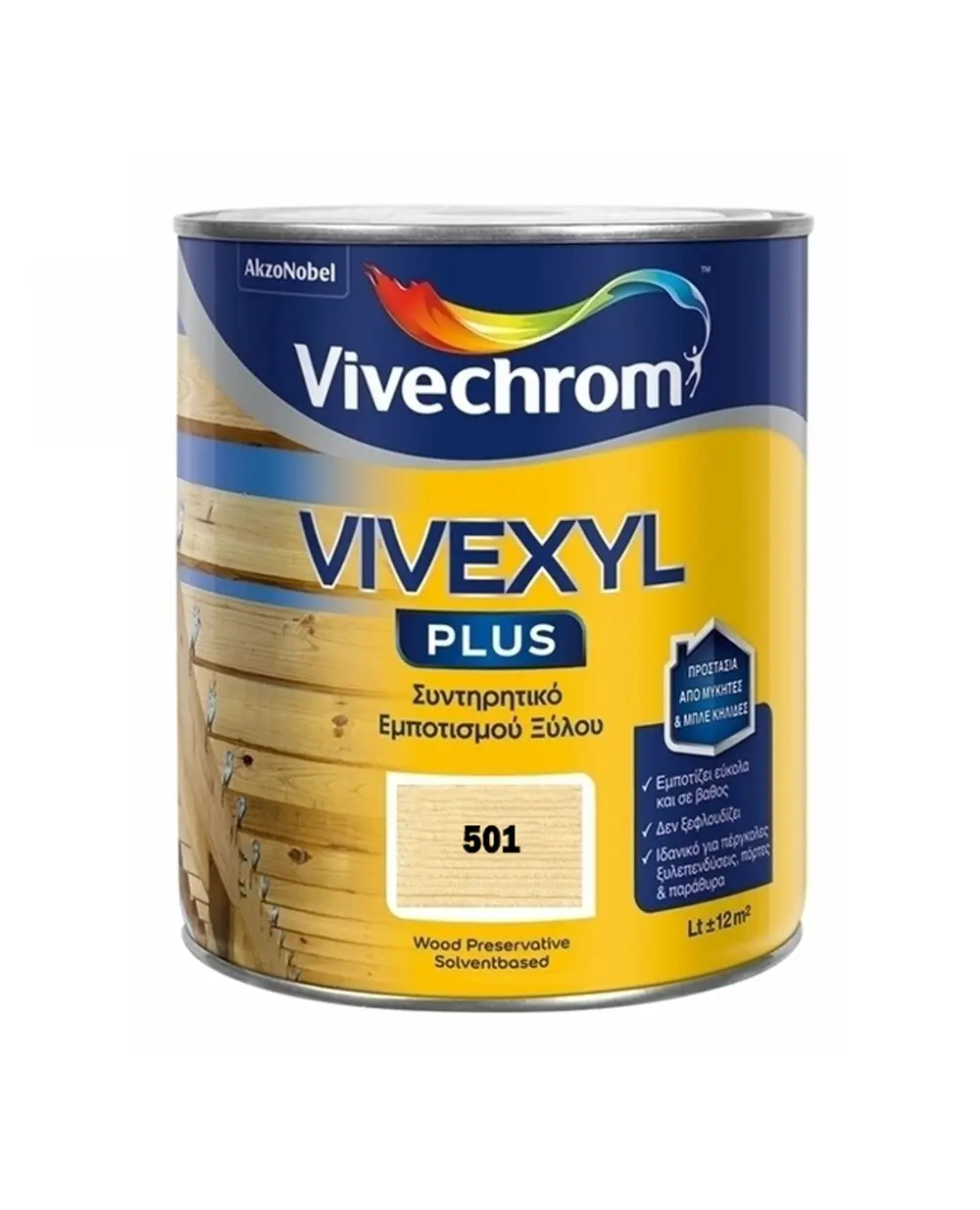 Το Συντηρητικό Εμποτισμού Ξύλου Διαλύτου Vivexyl Plus 501 Άχρωμο Ματ 750ml Βιβεχρώμ είναι συντηρητικό εμποτισμού ξύλου εξωτερικής χρήσης που διεισδύει στο ξύλο, το εμποτίζει εύκολα και σε βάθος και το προστατεύει από τους μύκητες / μπλε κηλίδες. Εφαρμόζεται σε πόρτες, παράθυρα, κουφώματα, ξυλεπενδύσεις, έπιπλα κήπου, υπόστεγα, αποθήκες, δοκάρια, πέργκολες, περιφράξεις.