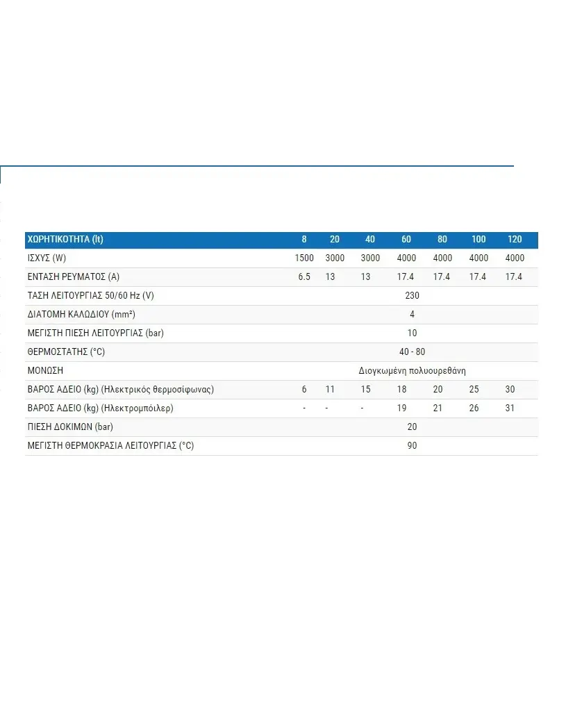 Διαθέτει καθοδική προστασία με ανόδιο μαγνησίου, για αποτελεσματική εσωτερική προστασία κατά της διάβρωσης και της επικάθισης των αλάτων,ρυθμιζόμενος θερμοστάτη,καί θερμική μόνωση οικολογικής πολυουρεθάνης υψηλής πυκνότητας.